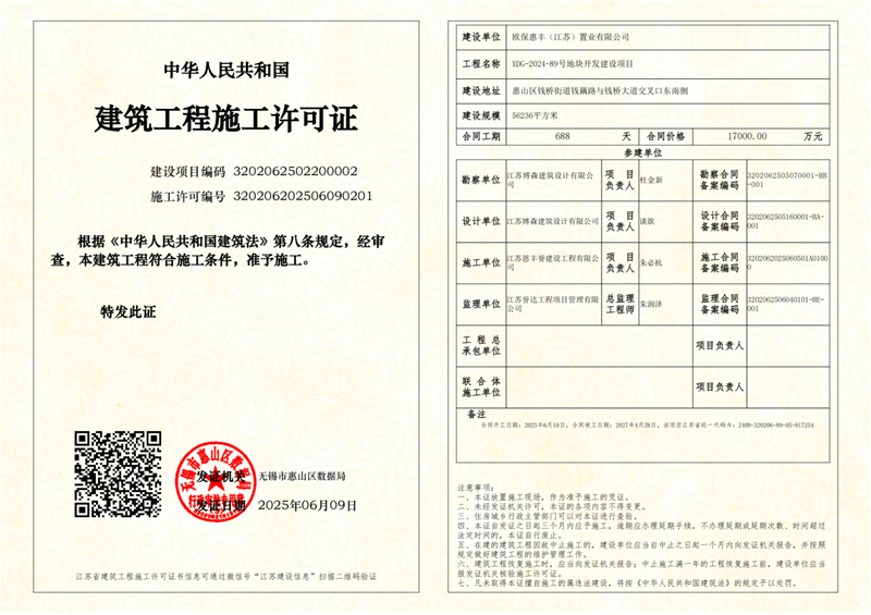 近日,公司中标的欧保惠丰(江苏)置业有限公司开发的无锡惠山区XDG-2024-89号地块开发建设项目正式开工。项目预计2027年4月竣工,2027年5月交付。